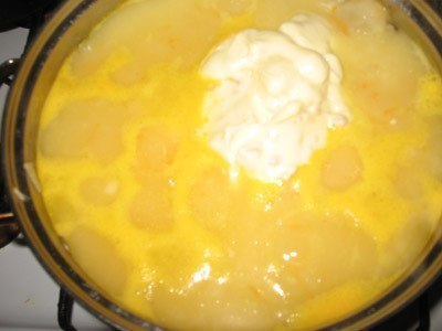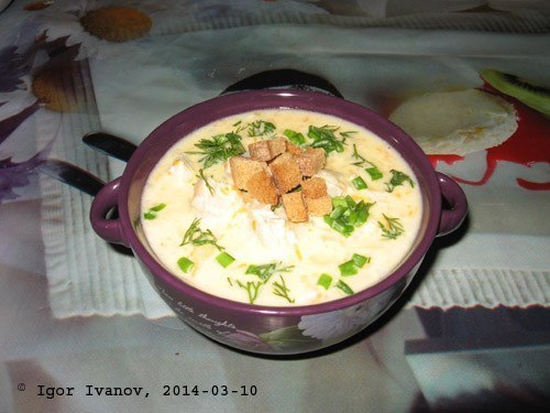 Ингредиенты: на 5 (или более) литровую кастрюлю 500 гр. куриное филе 400 гр. плавленый сыр (например Хохланд ванночка) 150 гр. рис 400 гр. картофель 150 гр. морковь 150 гр. лук соль перец зелень по вкусу Приготовление: Куриное филе залить 3 л. воды, и варить до готовности (25 минут после закипания). Когда филе будет готово, его надо вынуть. В кипящий бульон засыпать рис, варить 10 минут. Мясо нарезать небольшими кусочками. Лук мелко покрошить. Морковь натереть на мелкой терке. Картофель почистить, нарезать брусочками или кубиками. В бульон добавить картофель, лук и морковь. Посолить, поперчить. Варить 5-7 минут. Помешивайте суп! Ибо рис может попытаться пригорать ко дну. Затем добавить мясо, варить до готовности картофеля. Добавить сыр, хорошо перемешать и убрать с огня. При подаче посыпать зеленью. Приятного аппетита!